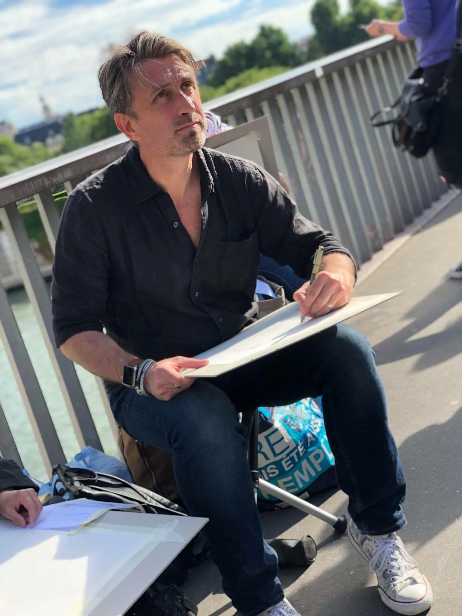 Alex Hillkurtz was born in England and grew up in California where he is a renowned storyboard artist for feature films, television, and commercials. His film credits include “Argo”, “Almost Famous”, “It’s Complicated”, and many others. Alex currently lives in Paris with his film editor wife, Tiffany, and enjoys discovering the hidden corners of the city that sketching and plein air painting allow. He uses the language of cinema to inform his images, moving beyond what one sees, and depicting what he wants others to see. He believes that in our too-crowded lives, sketching and plein air painting invite us to move at a more deliberate pace… a true sense of place, and sometimes unexpected stories are revealed.