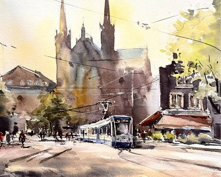 DESCRIPTION: We will learn about watercolour techniques, how to make good composition, how to create perspective in a cityscape, how to make the scene “alive” with figures of people.